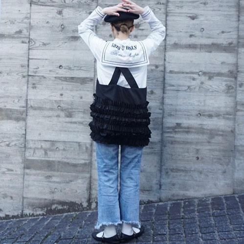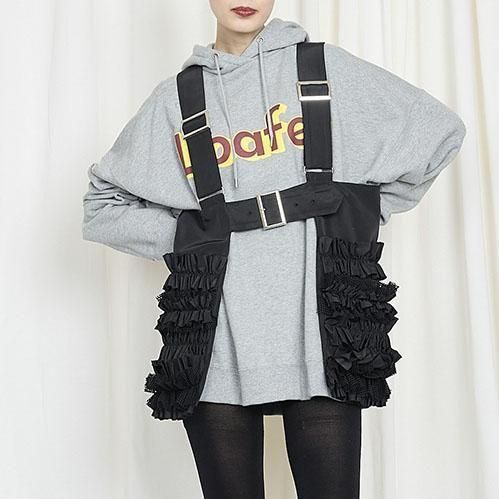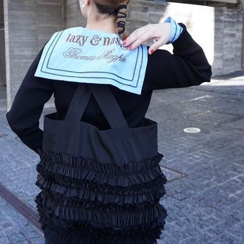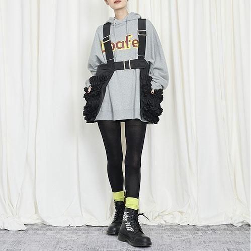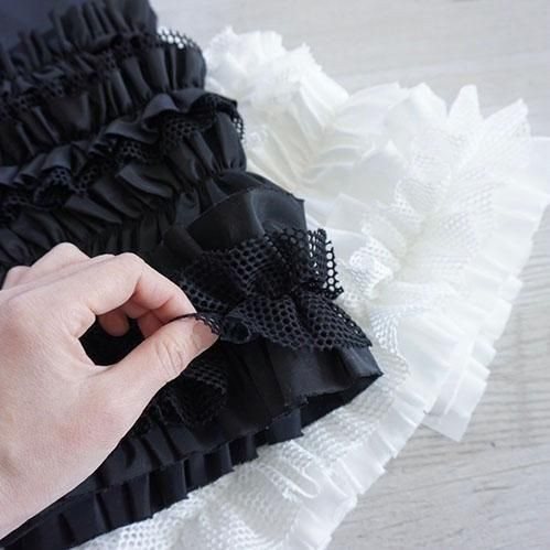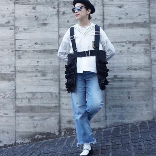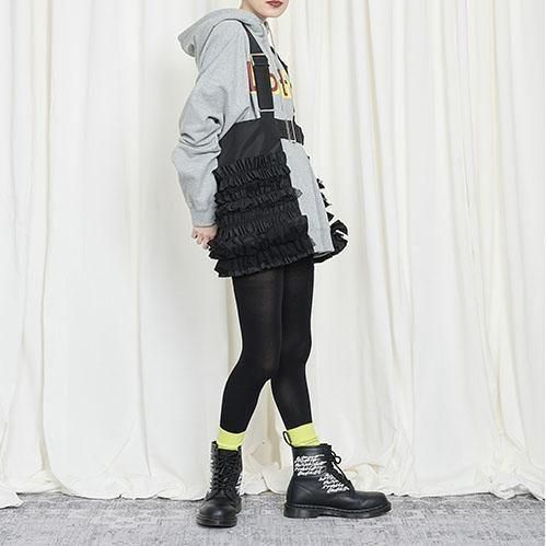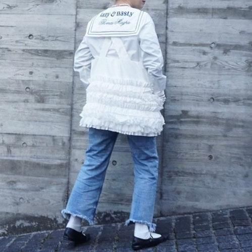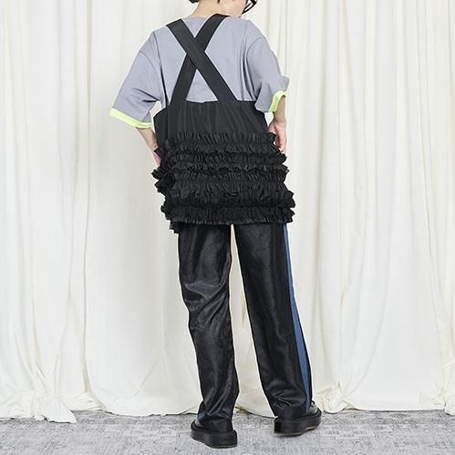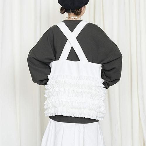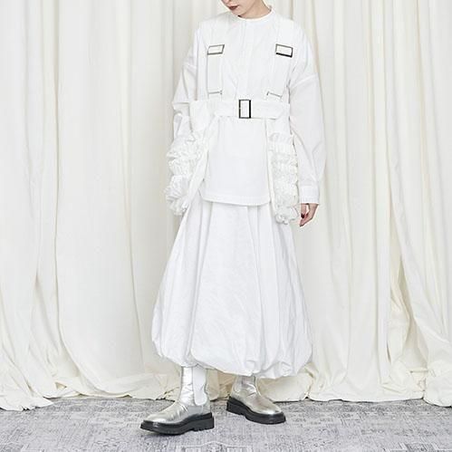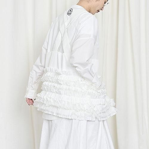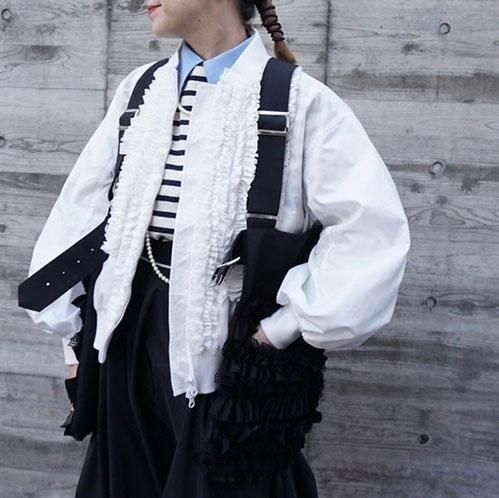 定番的に出しているポケットベストは今回はポリエステルタフタでナイロンライクな素材に変更して作っています。フリル部分もメッシュを入れてボリュームがある仕上げになっています。このベストはこれまでにも何度となく出してきましたが、毎回ヒットしていて、これまでにお買い逃しされた方にはとてもお勧めです。大きめのポケットが付いていて、ポケットのないお洋服の時にも大変便利で、春夏、秋冬もコートやジャケットの上にも重ねられるオーバーサイズにしています。購入された方の好きなバランスで好きなアイテムに合わせて着てください。ひとつ有れば、今までのお洋服が様変わりでき、また気になるヒップ周りをカバーできる万能なアイテムです。私はブラックを持っているので、今期はホワイトに挑戦したいと思っています。
