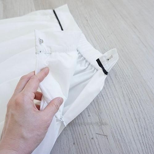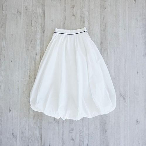 薄手のタフタでボリュームが出過ぎない大人のバルーンスカート。以前もデザインをやってみたものの、あまりバルーンが広がらなかったので今回はメモリータフタの薄手の素材を採用しチャレンジしました。思った以上にイメージ通りにでき、とても使いやすい新アイテムになっています。着用すると、バルーンがパンツのようにも見えて、モードな雰囲気も持っています。たっぷりとしたバルーンでロング。足首が少しだけ見える長さにしています。両サイドポケット付き。シンプルなので合わせやすいと思います。ウエスト部分にラインを入れて少しだけ個性を出しています。お勧めはブラックですが、今回はホワイトをテーマカラーにしているので、ホワイトもお勧めです。ホワイトはとてもルックが作りやすくて、合わせやすく万能でした。もし迷われる方がいたら、ホワイトも検討してみてください。真冬の真っ白スタイル、特にフリルブルゾン、ラッフルドベストとの相性が良くて魅力的に感じています。私はホワイトを購入したいと思っています。