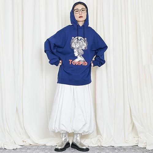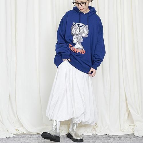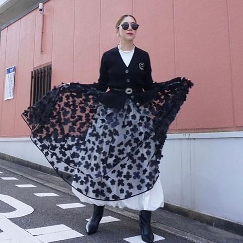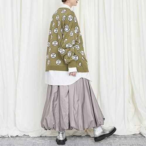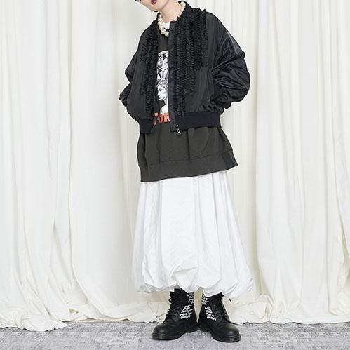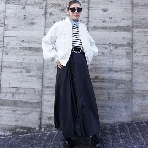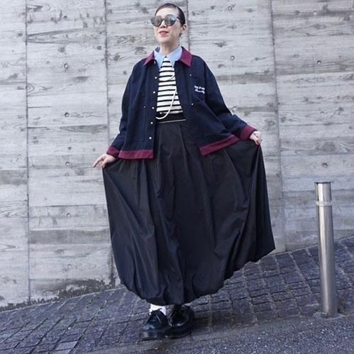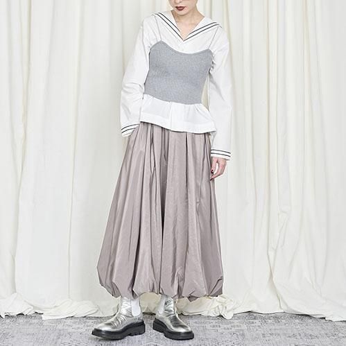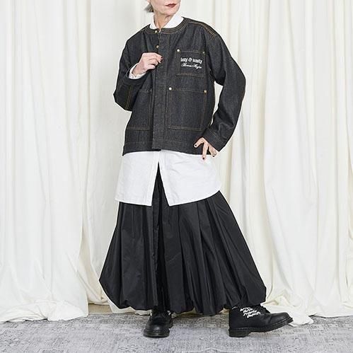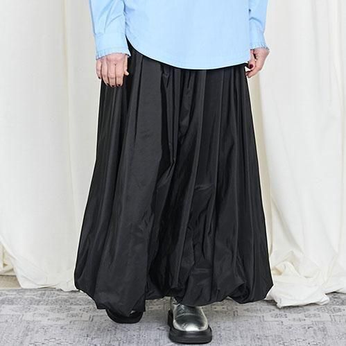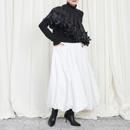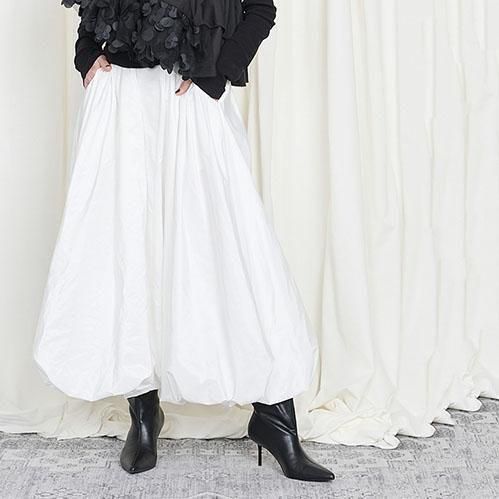 薄手のタフタでボリュームが出過ぎない大人のバルーンスカート。以前もデザインをやってみたものの、あまりバルーンが広がらなかったので今回はメモリータフタの薄手の素材を採用しチャレンジしました。思った以上にイメージ通りにでき、とても使いやすい新アイテムになっています。着用すると、バルーンがパンツのようにも見えて、モードな雰囲気も持っています。たっぷりとしたバルーンでロング。足首が少しだけ見える長さにしています。両サイドポケット付き。シンプルなので合わせやすいと思います。ウエスト部分にラインを入れて少しだけ個性を出しています。お勧めはブラックですが、今回はホワイトをテーマカラーにしているので、ホワイトもお勧めです。ホワイトはとてもルックが作りやすくて、合わせやすく万能でした。もし迷われる方がいたら、ホワイトも検討してみてください。真冬の真っ白スタイル、特にフリルブルゾン、ラッフルドベストとの相性が良くて魅力的に感じています。私はホワイトを購入したいと思っています。