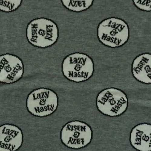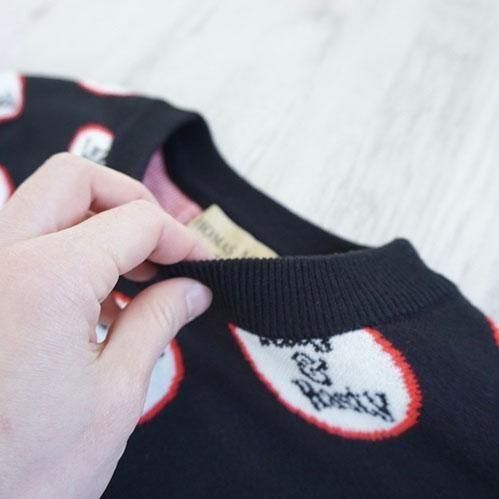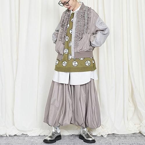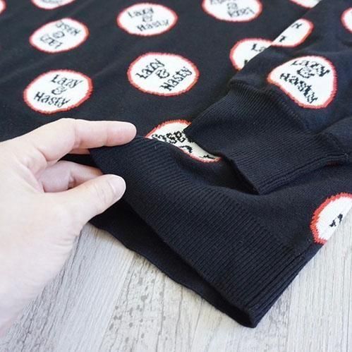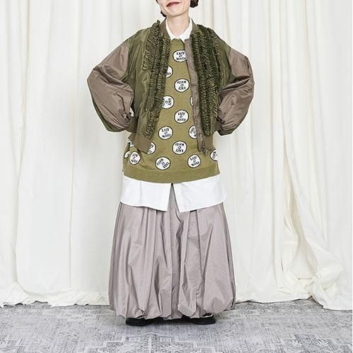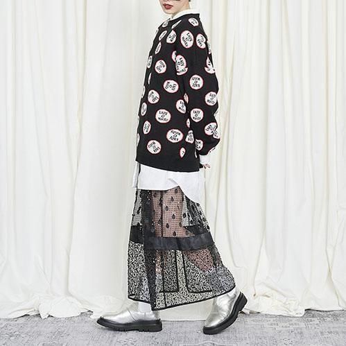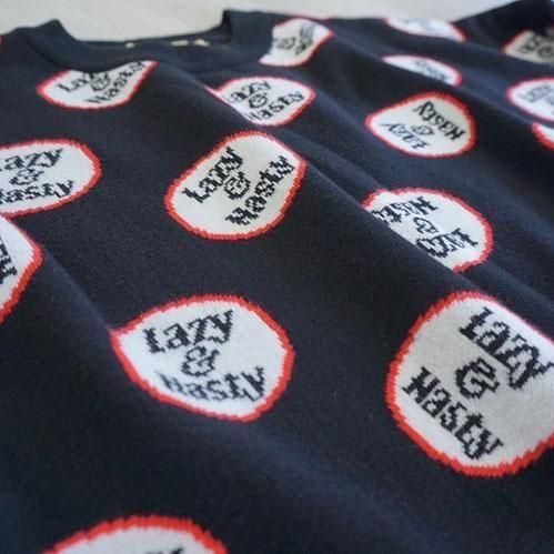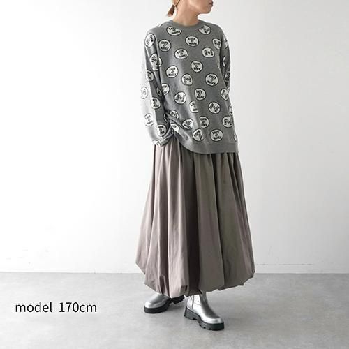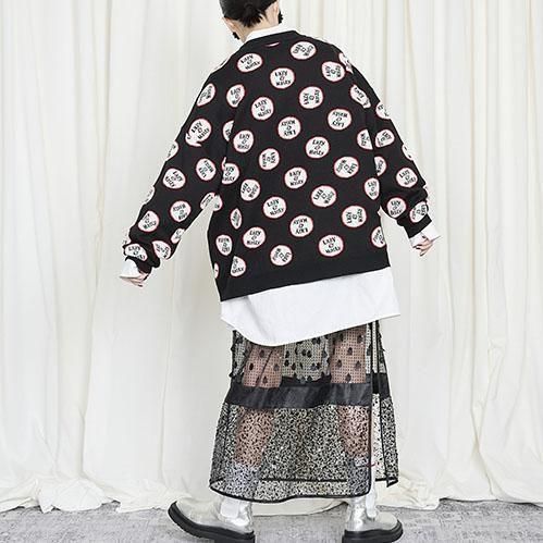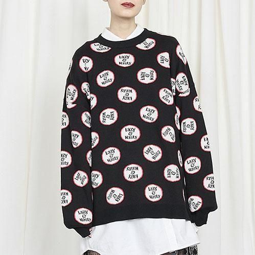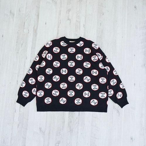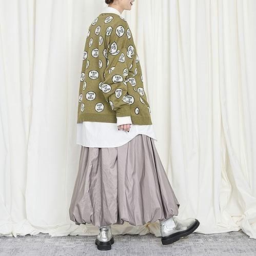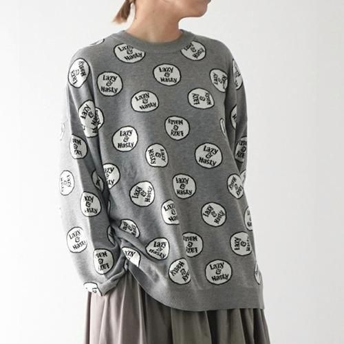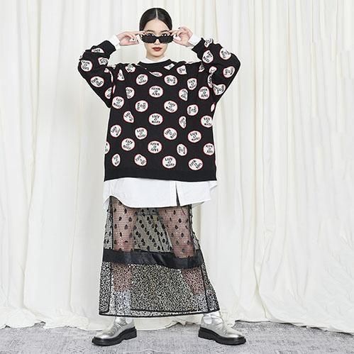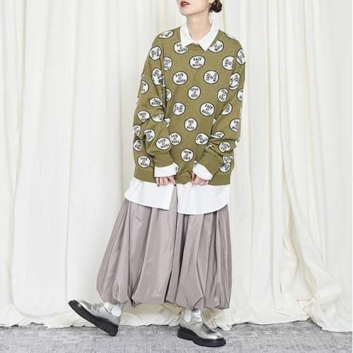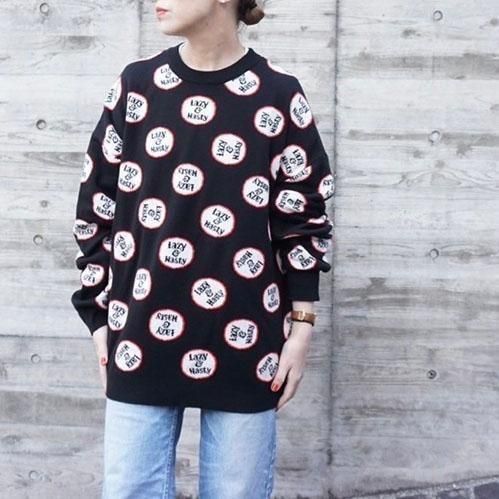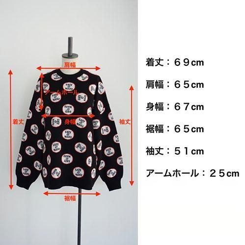 今回のテーマになっているロゴを総柄に配したオーバーサイズのダブルジャガードのニットです。