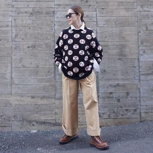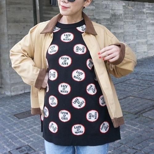 スタッフに人気ナンバーワンの柄で、今回予約品にピックアップしています。オーバーサイズなので男性、どんな体型の方にもお勧め。袖も長めにしていますが、いつものように細くて小柄の女性が着用しても、袖口を小さめにして袖をたくし上げても止まるように設定しました。今回のニットの中で1番前評判が良いアイテムでした。どなたにも合わせやすい使えるアイテムになると思います。私もこの柄が、とてもイメージ通りに仕上がり気に入っています。
