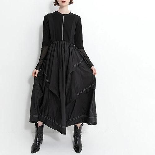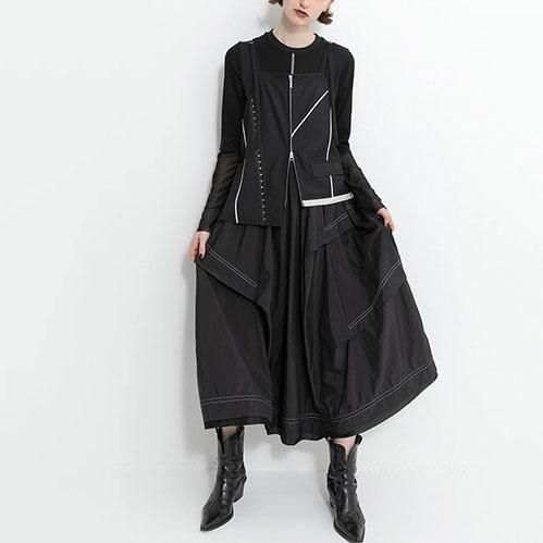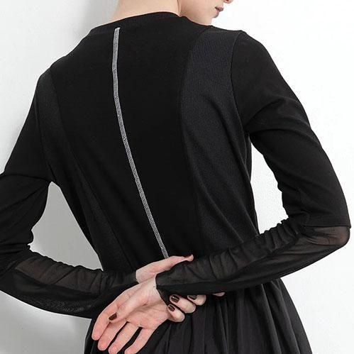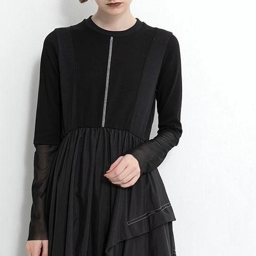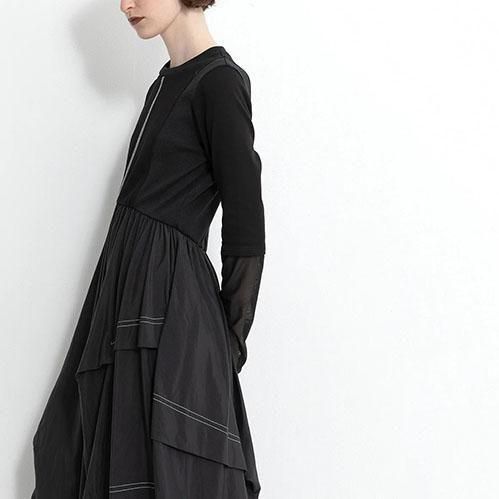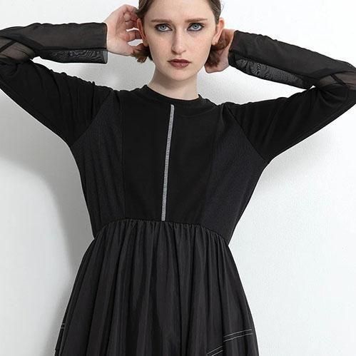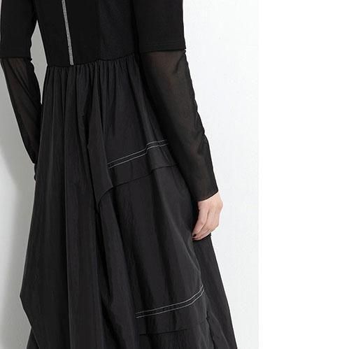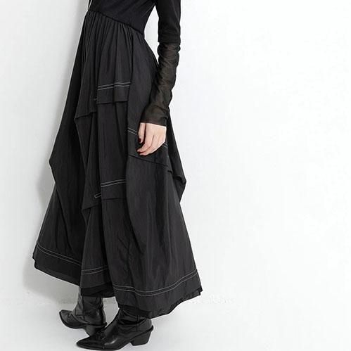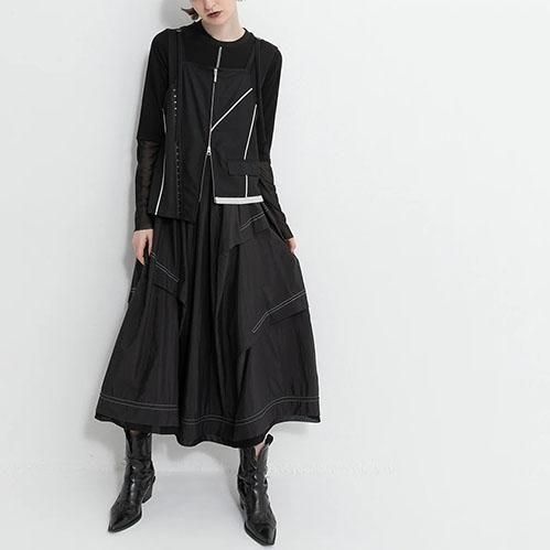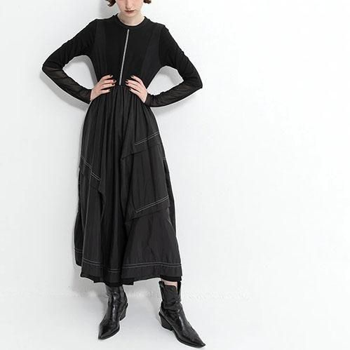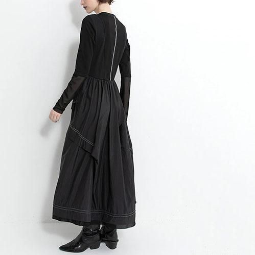 袖の下側にメッシュ素材を使用し、スカート部分はアシンメトリーにタックを取り、動きをつけたデザイン。