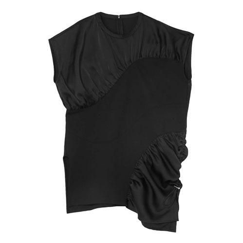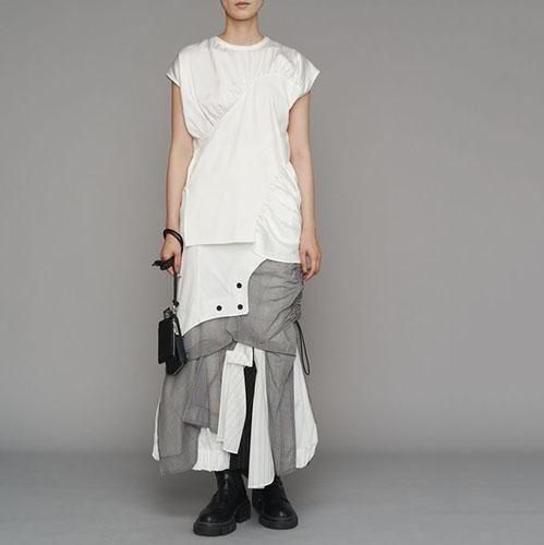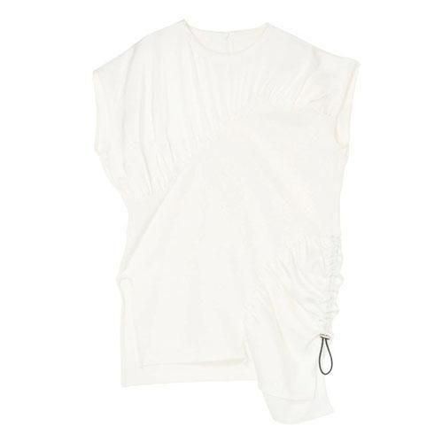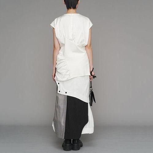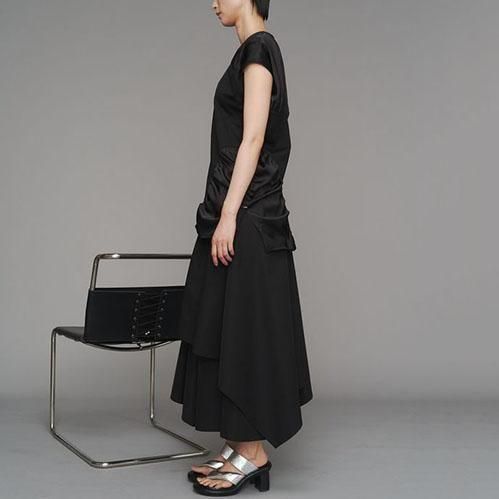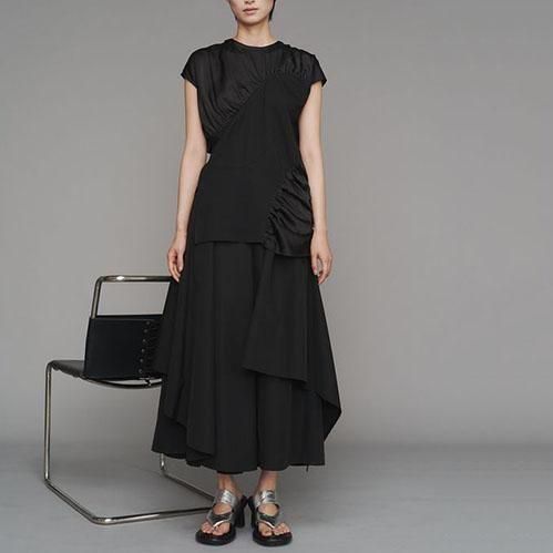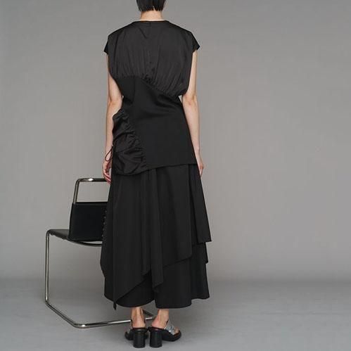 キーディテールのラウンドカッティングが特徴のフレンチスリーブトップ。光沢のあるサテン地とスウェットをドッキングし、ギャザーのふわっと感がより引き立つデザインとなっています。気になる肩回りをカバーしながら細見えするシルエットがポイント。同素材でパンツも展開しているのでセットアップでの着用もオススメです。