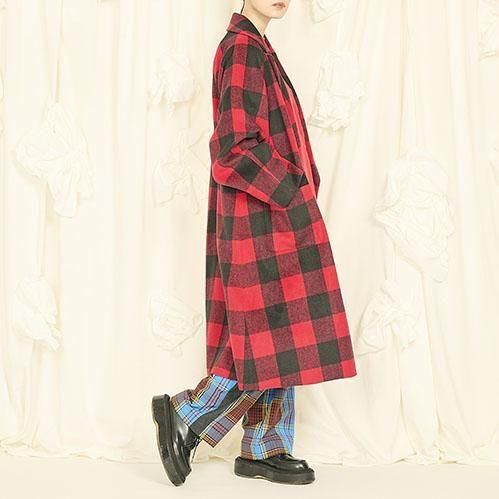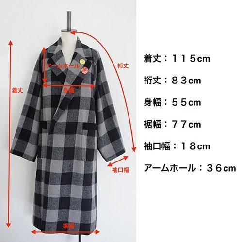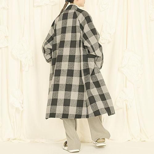 今回初めてのチェック柄です。以前からずっと作りたいと思っていて、やっと良い生地が見つかりました。膝下くらいになる長めの着丈にしています。ややオーバーサイズで、スタッフに大変人気の高いコートです。体型は選びません。アーム、身頃はかなりゆったりしています。私の作るコートは襟幅が狭くスッキリしているものが多いのが特徴でしたが、今回のコートはやや襟を広めに作っています。少し気分が変わり新鮮なデザインになったような気がします。袖が曲げられるので身長が低めの方にも良いと思います。