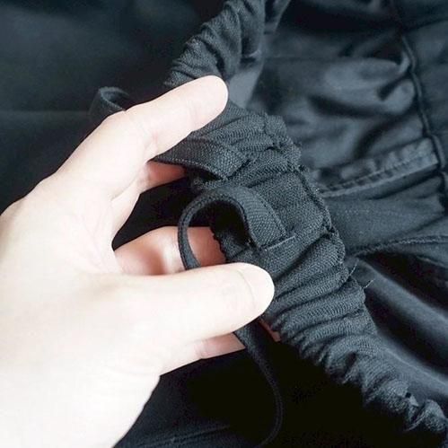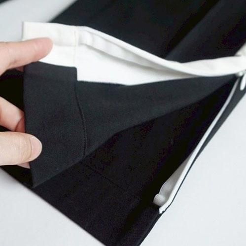 サイドに太めのラインを入れてスポーツテイストにしています。またフロントにはセンターラインのステッチを入れていて、ちょっと大人のカジュアルパンツになっています。裾にはファスナーを付けてみました。開いたまま履いてもとてもかわいいと思います。コンシールファスナーが目立ちすぎず、カジュアルといえどもオフィスなどでも履いてもらえると思います。
