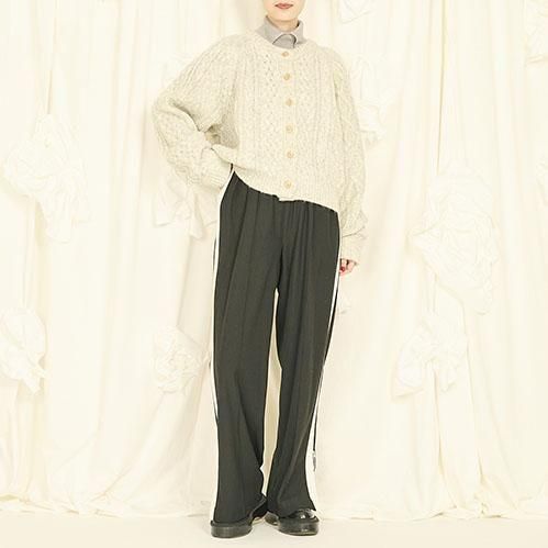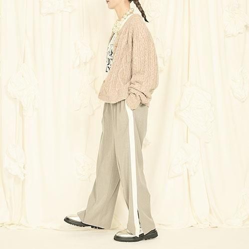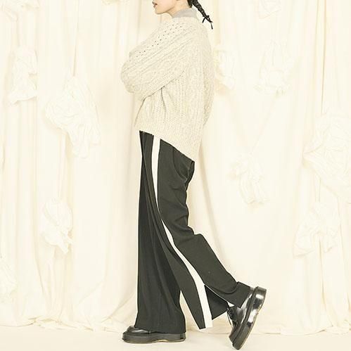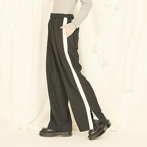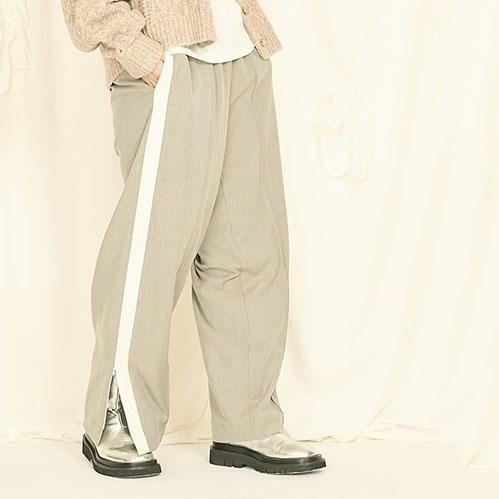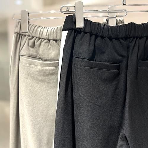 ドロストの紐が入っているウエストで調整自由、ワイドなシルエットのストレッチの効いているジャージー素材のサイドラインパンツ。履き心地が最高に良いのが特徴になっています。