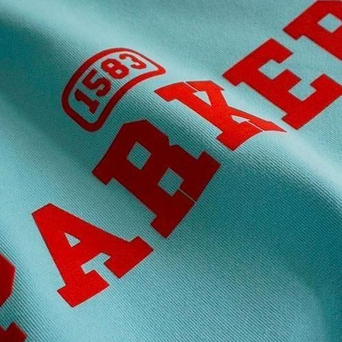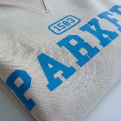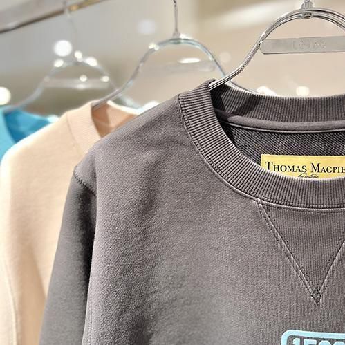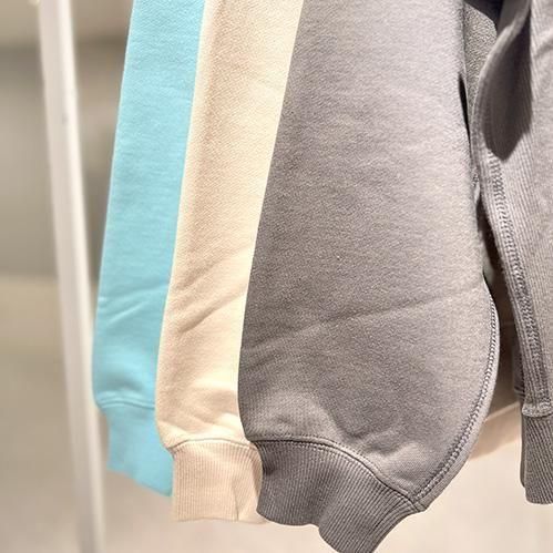 今回私が1番好きなロゴのスウェット。フロッキーでプリントしています。キレイなサックスブルーの文字にクリーム色のボディ。この組み合わせが、とても好みです。