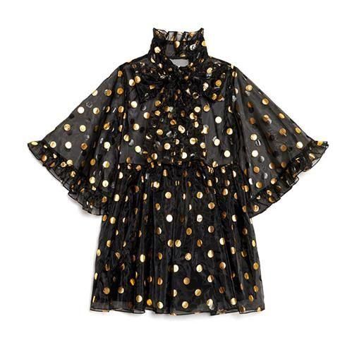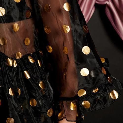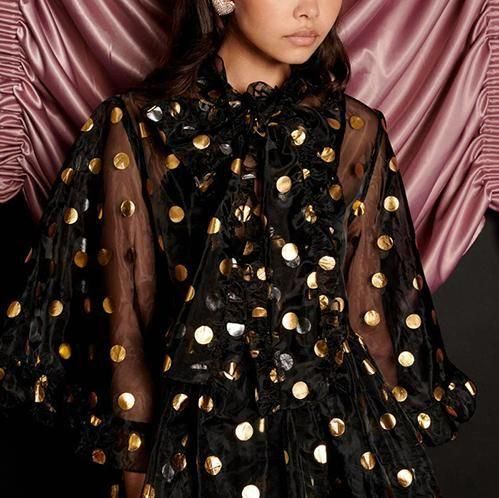 メタリックなドット柄オーガンジーに遊び心のあるフリルタイをあしらった、色っぽさのあるアイテム。