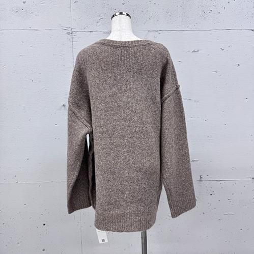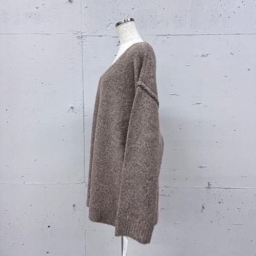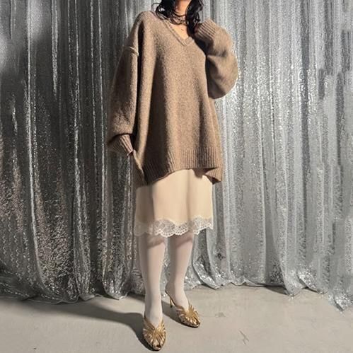 深めのVネックが抜け感を演出する、柔らかな表情のオーバーサイズニット。